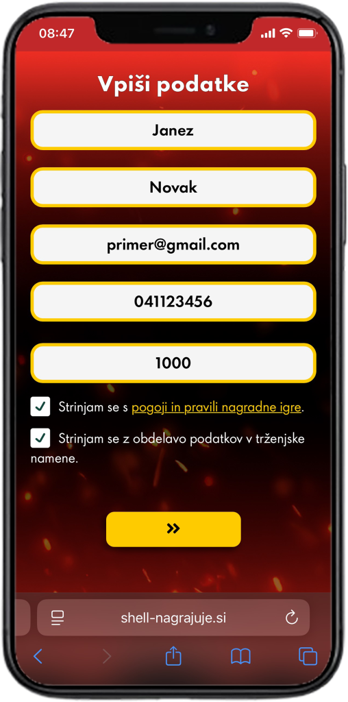 - Potrditi strinjanje s pogoji sodelovanja (obvezno) ter morebitno strinjanje z obdelavo podatkov za trženjske namene (neobvezno), nato klikniti označeno potrditveno polje – puščica >>.