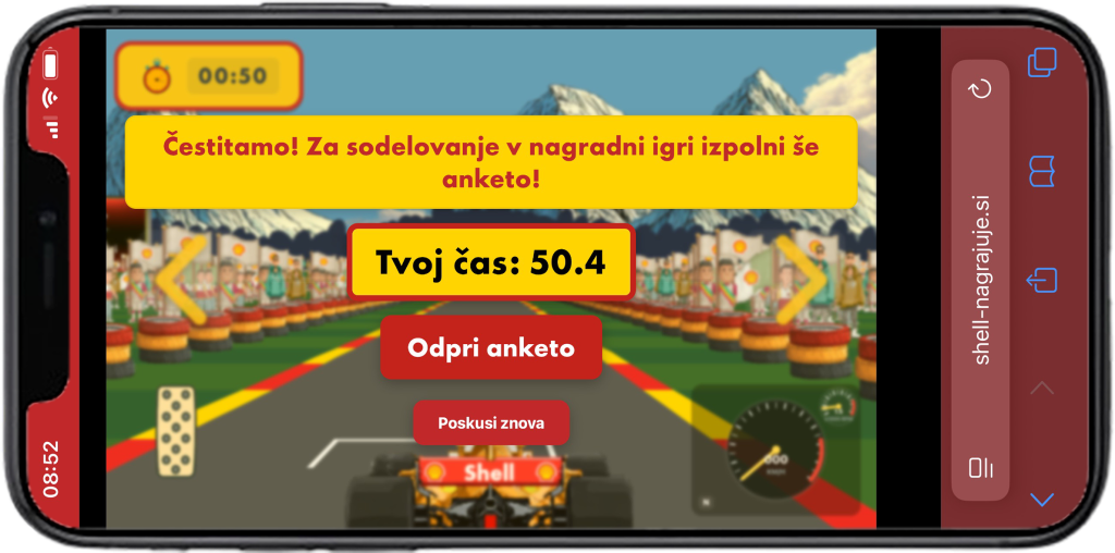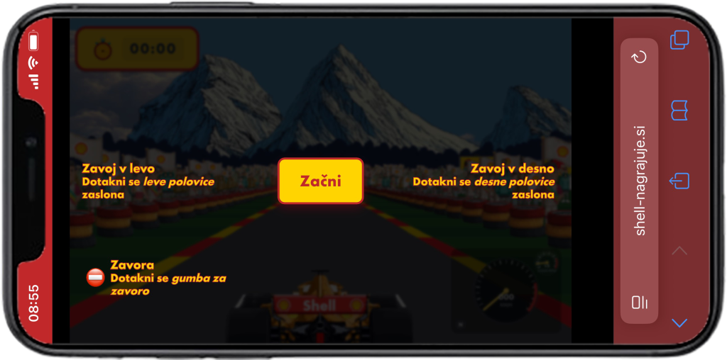 - Upoštevati navodila in odigrati igro. Igra se začne s klikom na gumb Začni. Za zavoj v levo mora udeleženec klikniti na levo stran zaslona, za zavoj v desno pa na desno stran zaslona (oziroma klikniti na puščico levo in desno). Za upočasnitev formule je potreben klik na zavoro, ki se nahaja v levem spodnjem kotu zaslona.